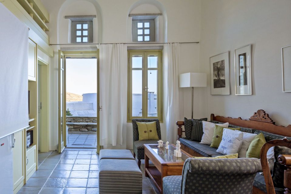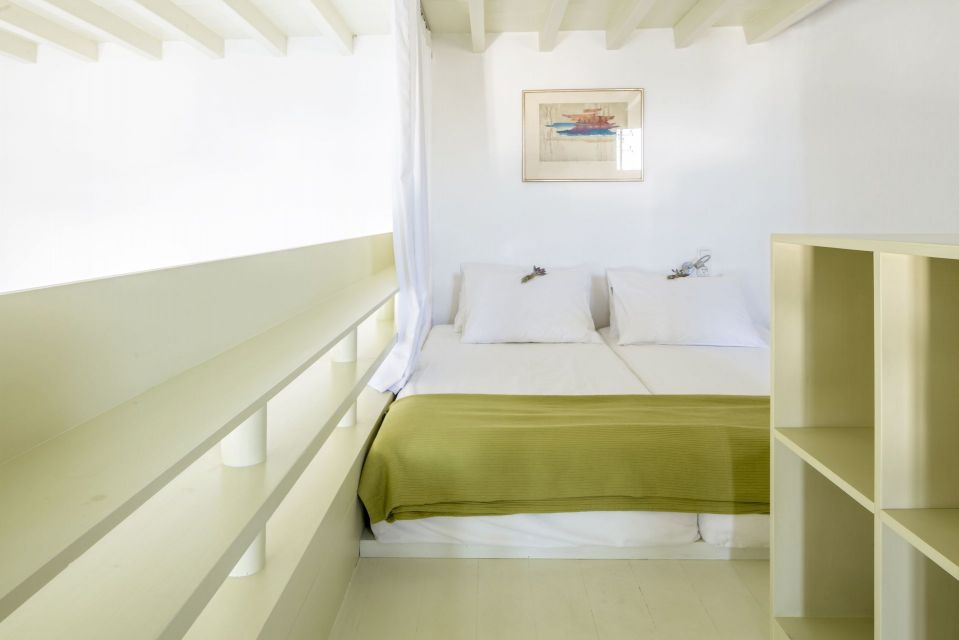 Ascend the wooden staircase to the loft level, where you'll find a delightful twin bedroom with two single beds, side by side – perfect for children. A small balcony on this level offers breathtaking views of the Aegean Sea, the island of Delos, and the surrounding Tinos landscape.