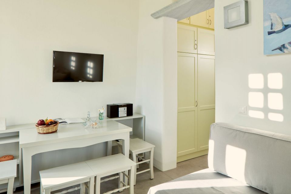 Perched on the upper level of a building complex of our countryside boutique hotel, the Vista Quarters truly lives up to its name ("Ano Thea" in Greek means "Upper View"). The spacious living area features a comfortable dining and sitting area, where two comfortable sofas conveniently convert into single beds with premium mattresses, ensuring a restful stay for up to four guests. The bedroom, with a built-in double bed, boasts a private small balcony, with stunning views of the Aegean Sea and the island of Delos. A fully equipped kitchen is perfect for preparing light meals and snacks. The modern bathroom includes a refreshing shower and complimentary all the necessary accessories and toiletries.